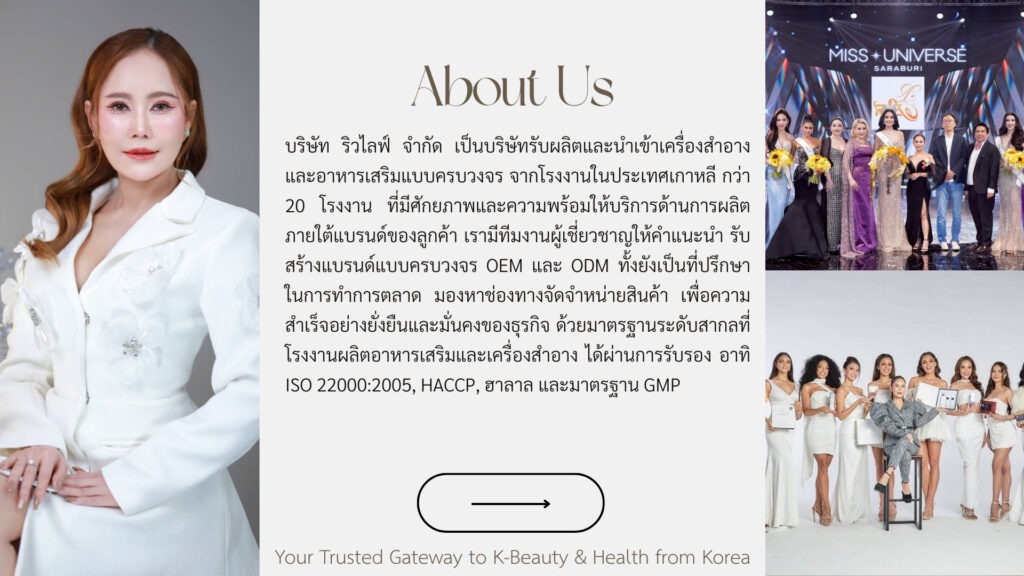 บริษัท ริวไลฟ์ จำกัด เป็นบริษัทรับผลิตอาหารเสริม และรับผลิตเครื่องสำอาง ครบวงจร ที่โรงงานในประเทศเกาหลี กว่า 100 โรงงาน ที่มีศักยภาพและความพร้อมให้บริการรับจ้างผลิตเครื่องสำอางค์ อาหารเสริม รับผลิตผลิตภัณฑ์เพื่อดูแลสุขภาพและความงามภายใต้แบรนด์ของลูกค้า เรามีทีมงานผู้เชี่ยวชาญให้คำแนะนำ รับสร้างแบรนด์อาหารเสริม แบบ OEM ตั้งแต่ต้นจนจบ ทั้งยังเป็นที่ปรึกษาในการทำการตลาด มองหาช่องทางจัดจำหน่ายสินค้า เพื่อความสำเร็จอย่างยั่งยืนและมั่นคงของธุรกิจของคุณ ด้วยมาตรฐานระดับสากลที่โรงงานผลิตอาหารเสริมและเครื่องสำอาง ได้ผ่านการรับรอง อาทิ ISO 22000:2005, HACCP, ฮาลาล และมาตรฐาน GMP